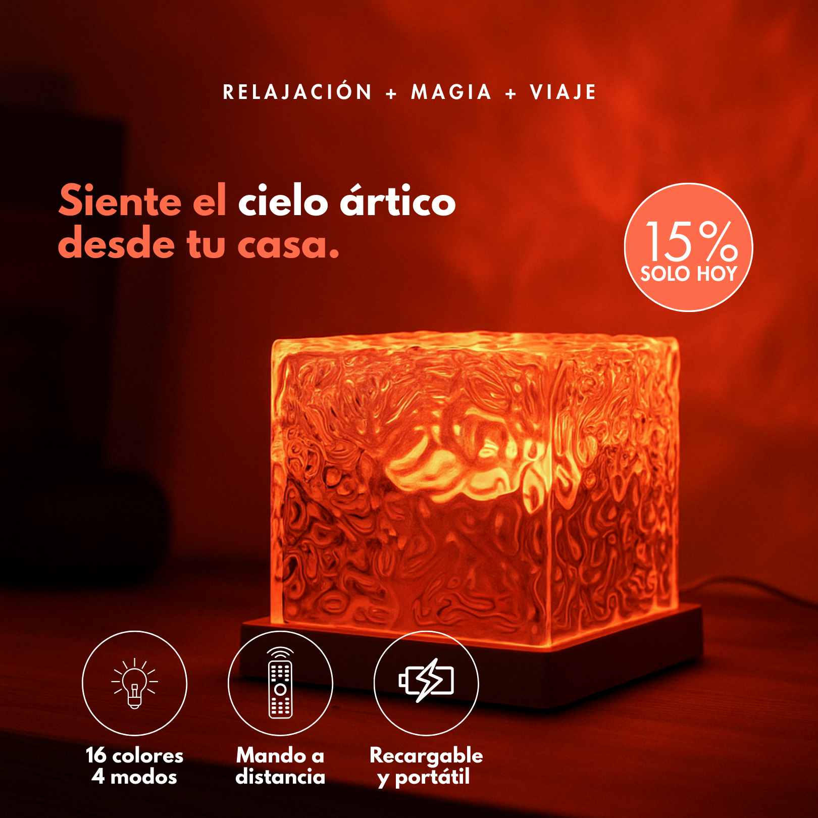Simula las auroras boreales en tu hogar con 16 colores, 7 intensidades y 4 modos de iluminación. Control táctil o con mando. Recargable, portátil y perfecto para relajarte, dormir o ambientar cualquier espacio.